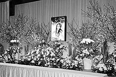 飯島愛(ài)的遺體告別式現(xiàn)場(chǎng)布置得非常肅穆,中央場(chǎng)地懸掛了飯島愛(ài)遺照,是由日本知名攝影師筱山紀(jì)信拍攝的,曾刊登在《婦人公論》上。同時(shí)祭壇上還擺滿了飯島愛(ài)生前最喜歡的卡薩布蘭卡,這種花的花語(yǔ)是永不磨滅的愛(ài)情,象征了家人友人,以及粉絲們對(duì)飯島愛(ài)永不磨滅的愛(ài)。周圍用樹枝和純白鮮花做裝飾,場(chǎng)地整體顯得肅穆莊重。