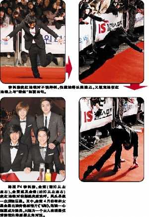 有 “韓國(guó)金球獎(jiǎng)”之稱的第45屆百想藝術(shù)大獎(jiǎng),2月27日在首爾奧林匹克公園舉行,朱鎮(zhèn)模憑古裝愛(ài)情片《霜花店》首次登上影帝寶座,憑《妻子結(jié)婚了》獲頒青龍影后的孫藝珍亦再下一城成功封后。不過(guò),若論風(fēng)頭,眾星就始終不敵《花樣男子》捧紅的韓版F4。四子以一身官仔骨骨的黑西裝走紅地毯,兩旁影迷及傳媒已尖叫不斷,有“粉絲”為見偶像不惜爬上樹又站上凳子,期間“粉絲”互相推撞,險(xiǎn)釀成意外。把頭發(fā)燙直的“韓版道明寺”李民浩大概是興奮過(guò)頭,走紅地毯時(shí)不慎被階梯絆倒,大出洋相。幸好這一跌跌得有價(jià)值,他擊敗《花》劇中的好兄弟金范捧走電視組別最佳男新人獎(jiǎng),名副其實(shí)“仆倒攞獎(jiǎng)”!李民浩領(lǐng)獎(jiǎng)時(shí)表現(xiàn)激動(dòng),更不介意提及糗事,為紅地毯摔倒一事致歉。至于“韓版花澤類”金賢重就奪得最佳電視人氣獎(jiǎng)。