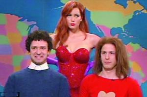 上周末,賈斯汀亮相節(jié)目《周末直播》時,以四格漫畫人物Cathy老公Irving造型出現(xiàn)。正當(dāng)他對著安迪·薩姆伯格扮演的Cathy表白時:“就算《誰陷害了兔子羅杰》里的兔女郎出現(xiàn),我眼睛都不會眨一下。”現(xiàn)任女友杰西卡·貝爾便以該人物的性感造型現(xiàn)身,還邀請賈斯汀一起散步。這是兩人拍拖后首次同臺表演,令現(xiàn)場觀眾十分驚喜。