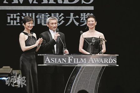 徐克與施南生手拖手出場(chǎng),部分嘉賓站立拍掌。徐克在臺(tái)上懷念一班已故電影人,他說:“25年前的3月23日,正是我與施南生構(gòu)思成立電影工作室的日子!贝藭r(shí),臺(tái)下的吳宇森大聲喝彩。徐克與施南生從林青霞手上接過獎(jiǎng)座后,互相親臉祝賀。