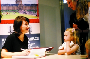 因行程緊,比諾什晚了近一小時才到。狹小的法國文化中心里,等待“才女”的中外影迷排到了大門外,有坐輪椅的,有帶小孩的!熬偷瓤匆谎鬯嫒恕边@樣的興奮低語此起彼伏。有人借著簽售給比諾什遞去寫得滿滿的信,也有沒買書仍擠上前去的,還有自稱看了三場《我之深處》的比諾什“舞迷”。更多的人拿起300元一本的書,掂了掂就放下了,轉而扶緊相機捕捉影星顰笑。