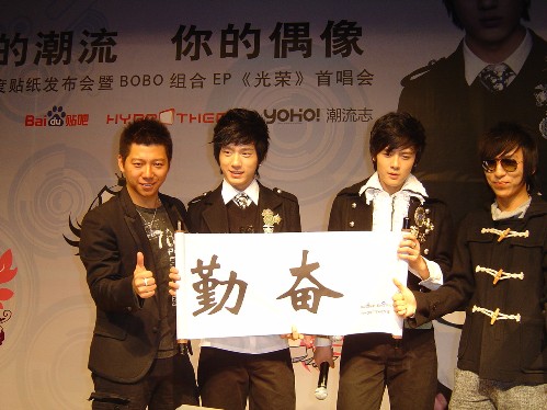 發(fā)布會(huì)宣布了百度與華誼兄弟達(dá)成戰(zhàn)略合作伙伴關(guān)系,接下來(lái)雙方將在娛樂(lè)領(lǐng)域展開(kāi)更深入的合作。一批百度的粉絲幸運(yùn)地免費(fèi)獲得了第一期貼紙,而隨著貼紙藝人BOBO組合登臺(tái)表演,會(huì)場(chǎng)的氣氛達(dá)到高潮。BOBO組合攜他們的第一份音樂(lè)作品《光榮》EP,首度公開(kāi)獻(xiàn)唱,而華誼音樂(lè)旗下樂(lè)隊(duì)組合前輩羽泉、演員羅海瓊也專程到場(chǎng)祝賀百度貼紙發(fā)布。