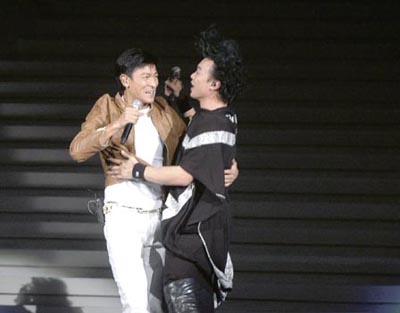 有好友捧場,Eason全程落力演出,華仔于11時(shí)從觀眾席上臺(tái),引得全場觀眾尖叫不停。華仔與Eason首先合唱《我恨我癡心》,其間3度擁抱,又互跪又鞠躬,情緒極度高漲。