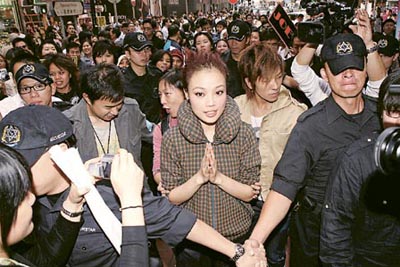 中新網(wǎng)11月19日電 容祖兒昨日現(xiàn)身銅鑼灣鬧市為新碟《Glow》宣傳,并出席“容祖兒X百老匯零距離全接觸照相會(huì)”活動(dòng)。當(dāng)她出現(xiàn)在活動(dòng)場(chǎng)地時(shí),大批歌迷蜂擁上前,祖兒在保安護(hù)駕下向大家發(fā)放海報(bào),并以雙手護(hù)胸防偷襲。