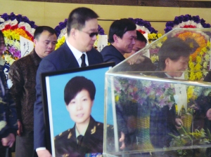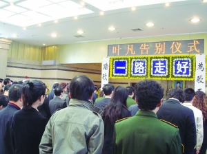 昨天的追悼會(huì)現(xiàn)場(chǎng)不但來了很多葉凡生前的好友,也來了不少葉凡生前的戰(zhàn)友,據(jù)武警文工團(tuán)政委尚力峰介紹,“當(dāng)聽說葉凡去世的消息后,所有和她合作過的戰(zhàn)友都驚呆了,我們都不知道她的病情居然那么嚴(yán)重,她沒告訴我們,是不想讓我們操心啊!因?yàn)槲渚墓F(tuán)即將要有幾個(gè)大型的演出,所以戰(zhàn)友們不能全來,但他們送上了花圈表示哀悼。葉凡在我們團(tuán)是出類拔萃的臺(tái)柱子,大型晚會(huì)不能少了她,她平時(shí)對(duì)自己要求十分嚴(yán)格,對(duì)于創(chuàng)作也是一絲不茍。有一次某地發(fā)生洪澇災(zāi)害,葉凡主動(dòng)請(qǐng)求到一線演出慰問,并創(chuàng)作《真情永遠(yuǎn)》。2003年非典時(shí)期,葉凡已經(jīng)得病,但她沒有說任何理由,再次主動(dòng)要求參加創(chuàng)作,并寫出《天使的故事》,讓全團(tuán)都為之感動(dòng)。她也多次獲得過文化部一等獎(jiǎng),可以說現(xiàn)在正是葉凡最輝煌的時(shí)期,可她卻離我們而去,太可惜了!”