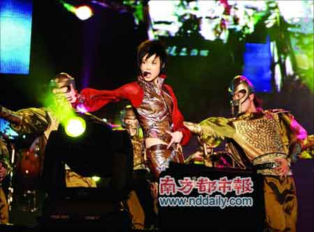 壓軸的李宇春一出場就聲勢浩大。煙火四射,黃色氣球簇擁著一起升天,李宇春在龐大的伴舞團開路下殺到,滿場歡呼。大家一起和應(yīng)《我的王國》、《HappyHour》、《冰菊物語》和《kulala》,顯現(xiàn)李宇春依然是天娛一姐的地位。(記者 何穎珊)