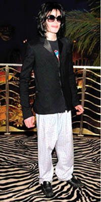 杰克遜近年飽受不利消息困擾,被指周身債之余,唱片銷量也大縮水,不過并沒有影響他慶祝50大壽的心情。上周四他現(xiàn)身賭城Planet Hollywood餐廳,與11歲兒子Prince Michael、10歲女兒Paris及6歲幼子Blanket一起吃晚飯,當(dāng)日杰克遜心情甚佳,對記者面露笑容,他坐著輪椅,全身用大披風(fēng)緊包,看來十分虛弱,而他拍照時西裝外套下露出的睡褲,格外引人注意。