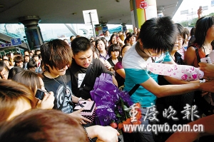 李宇春乘坐的航班計劃是在昨下午5時左右抵達,4時后江北機場的3號出口就已聚集了三四百名玉米,喊著他們自己的口號:“李宇春,重慶的”。每位玉米手上戴有一根黃絲帶,很有秩序地分成兩隊留出了約兩米寬的通道,隊伍最前面有十多名玉米,只待李宇春一出現(xiàn),就組成人墻將其包圍,以防止李宇春被熱情粉絲抓到。