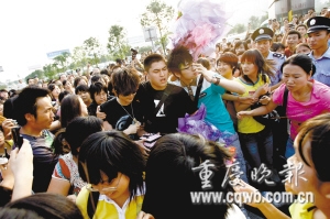 李宇春昨日抵達重慶江北機場,并將于今日在北碚參加一慈善活動。玉米們聞風而來高調(diào)接機。由于李宇春沒有走玉米們用人墻組成的通道,導致以講秩序著稱的玉米出現(xiàn)混亂場面。