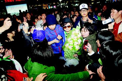 在歌聲與口號聲中,頭戴小禮帽、以乖乖學生模樣打扮的周筆暢亮相了,剎那間,筆親們的聲浪掀翻候機大廳,鮮花、閃光燈,一股腦兒涌向她,倒讓半年未公開露面的周筆暢有些局促,紅著臉揮著手,靦腆地環(huán)顧擁擠的人群。