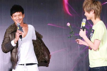 “李宇春2009WHYME廣州演唱會”昨日在京舉行了發(fā)布會,臺灣搖滾天王阿信和內(nèi)地明星黃曉明到場助陣。昨日在發(fā)布會上亮相時,她的造型讓在場觀眾大吃一驚,白色七分袖襯衫配一件天藍色大雙排扣開領(lǐng)套頭毛衫,黑色緊身褲再加上一雙加入金屬元素的皮鞋,隱隱透出些許女人味。隨后春春T恤裝再現(xiàn)帥氣扮相,接下來黃曉明的出現(xiàn)連春春都沒有預(yù)料到,他一上臺就為春春獻上一朵玫瑰花和一瓶1984年的法國紅酒,剛好與春春的出生年份相同,春春連呼“有心了有心了”。 聞聞
