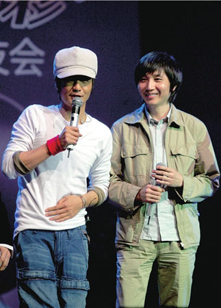 演出一開始,一向寡言的張亞東客串了一把主持人,直接把嘉賓樸樹請上臺(圖),講述他們合作《世界盡頭》的小故事。張亞東說非常感謝樸樹,因為他作曲的曲調(diào)很低,樸樹基本上是在壓著嗓子唱,并且樸樹為《世界盡頭》寫的詞打動了他,“我感覺到做音樂不再那么孤獨了”。