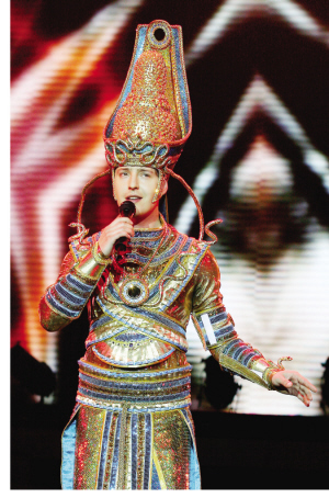 一曲唱罷,原本還是“未來風”的維塔斯立馬換了一套“中國風”的服裝——金燦燦的宮廷服裝,并用高音炫出一曲無歌詞作品《詠嘆調(diào)》。到了第三首作品,他則換上一身白衣,用標志性的“海豚音”唱起填上了俄文歌詞的中國歌曲《大海啊,故鄉(xiāng)》。