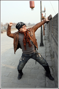 一身嬉皮風(fēng)格的裝扮,加上一副超大的黑框眼鏡,彭波看上去帶有明顯的“謝小盟后遺癥”。雖然只來過西安兩次,但彭波非常喜歡西安。去年在西安拍了一個(gè)多月電影,他已把城里好吃好玩的地方摸了個(gè)門兒清。他說:“好吃的太多,滿街都是美女。西安人爽快、實(shí)在,在這交了不少朋友,國力隊(duì)的江洪就是我哥哥。我已把這里弄得跟自己家一樣了,到處都特別熟!