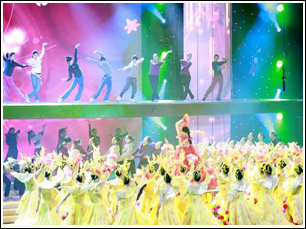 歌舞類節(jié)目時長為1小時,記者粗略計算,僅上半場的歌舞類節(jié)目就占了近50分鐘。開場舞《飛向春天》由185位女舞者共同完成,她們不斷變換隊形,時而如花潮涌動,時而像火山噴發(fā),熱鬧而奢華;舞蹈《飛天》題材獨特,7位女孩宛若傳說中的七仙女,舞步婀娜多姿。歌曲方面,費玉清有幸獨唱《千里之外》,其他歌曲則多以串燒形式登臺,龐龍的《啷咯情歌》、鳳凰傳奇的《月亮之上》、黃圣依的《天天向上》、胡楊林的《香水醉》、張瀾瀾的《一家人》、郭美美的《不怕不怕》分別占據流行板塊和新人板塊。