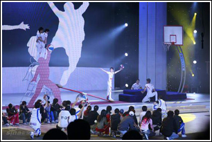 上半場聯排下來,有幾個非“主流”節(jié)目令人印象深刻。沈陽軍區(qū)前進雜技團表演的雜技《花式籃球》,演員們用嫻熟的技巧,把NBA賽場上球星們最迷人的“飛躍式灌籃”和花式籃球技巧,與雜技“跳板”的借力翻騰完美結合,他們在距離地面六七米的高空翻滾后完成扣籃動作,其中一個雜技演員還表演了手腳各執(zhí)一球、先后投籃的高難度動作,令人叫絕。