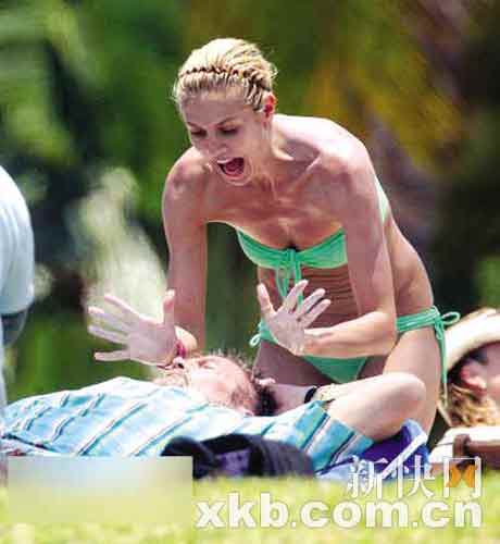 超模海蒂·克拉姆日前帶著雙親和孩子們到墨西哥海邊度假。盡管已為人母,但海蒂在雙親面前仍然如孩子般調(diào)皮,父親躺在海灘上休息,她趁其不備,張開雙手欲嚇父親,俯身時(shí)卻被狗仔隊(duì)拍到她小腹上層疊的肉圈。