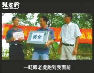 事隔4個(gè)多月后,近日“周老虎”還原真相成了紙老虎。隨后記者在斑點(diǎn)網(wǎng)等視頻網(wǎng)站上看到,從6月30日開始,全長(zhǎng)27分47秒的視頻小電影《拍虎》也被傳到網(wǎng)上,片中周正龍被稱為“周震聾”,因?yàn)榱謽I(yè)局張局長(zhǎng)承諾“如果當(dāng)?shù)卮迕裨谖覀兛疾礻?duì)進(jìn)山之前能發(fā)現(xiàn)華南虎,我們會(huì)給一箱錢作為獎(jiǎng)勵(lì)”,于是“周震聾”十分興奮,上山尋虎十幾天,最后與人密謀通過(guò)年畫拍出華南虎照片。全片最后表現(xiàn)“周震聾”在事情敗露后,從山崖摔下導(dǎo)致失憶,人也變得瘋瘋癲癲,成天抱著個(gè)假老虎模型唉聲嘆氣。