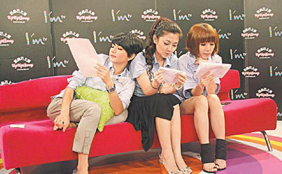 中新網(wǎng)9月26日電 S.H.E最近成立自己的網(wǎng)絡(luò)電臺(tái),其中有1天的節(jié)目和im.tv合作,讓粉絲能“看”到她們主持的模樣。準(zhǔn)備錄音時(shí),Hebe(右起)和Selina認(rèn)真研讀主持稿,只有Ella脫鞋又摳腳,還倒在Selina身上,坐沒坐相。這些畫面要是上網(wǎng)大放送,真會(huì)大傷形象。