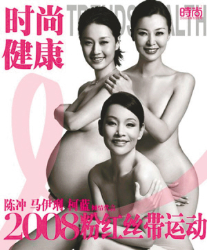 以關(guān)愛女性健康為宗旨的“粉紅絲帶行動”每年都會找一些女星來作宣傳。今年他們找來了懷胎9月的馬伊琍和陳沖、柯藍(lán)則拍攝了一組全裸照片,展現(xiàn)女性的自信和美麗。這組照片于日前公開刊發(fā)在《時(shí)尚健康》雜志上。