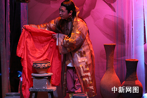 該劇是以發(fā)生在澠池仰韶村一個陶藝世家的制陶故事為背景,通過秦王的兒子邂逅彩陶女所產(chǎn)生的愛情故事為主線,整個劇情起伏跌宕,臺詞風(fēng)趣幽默,令觀眾沉醉在悲喜交加的人物命運中。影視戲劇演員張成曉勇的精彩演繹博得了全場觀眾的陣陣掌聲和喝彩。當(dāng)絢麗的舞臺燈光變幻出滿場旋轉(zhuǎn)的來自澠池縣仰韶村彩陶坊的精美彩陶時,把整個劇情推向了高潮,令在場的首都觀眾驚嘆不已。樸拙俊美的仰韶彩陶的確是在金黃的季節(jié)里給首都的觀眾上了一道視覺文化大餐。