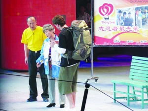 情節(jié):北京奧運(yùn)會(huì)期間,蔡明十分羨慕志愿者。她遇見(jiàn)了穿著志愿者服的郭達(dá),于是纏著他,要跟他一起幫助來(lái)北京的客人。兩人遇見(jiàn)了急著找?guī)捻n國(guó)小伙子,因?yàn)槁?tīng)不懂小伙子說(shuō)啥,折騰了半天才明白過(guò)來(lái),直把小伙子急得捂著小腹,滿(mǎn)地亂跳。接著兩人遇見(jiàn)了迷路的美國(guó)小伙子。美國(guó)小伙子只會(huì)說(shuō)簡(jiǎn)單的中文,郭達(dá)只會(huì)說(shuō)Welcome to beijing這么一句外語(yǔ),于是又是一陣瞎鬧騰。蔡明指手畫(huà)腳,希望用肢體語(yǔ)言讓小伙子明白各種地名,但越搞越亂。此時(shí),真正的志愿者上場(chǎng),原來(lái)郭達(dá)只是穿了人家晾在外面的志愿者服。蔡明、郭達(dá)失落之時(shí),遇見(jiàn)走失了新郎的新娘,兩人想盡辦法幫她找到了新郎,十分高興,最后大家邊為觀(guān)眾發(fā)喜糖邊退場(chǎng),喜氣十足。