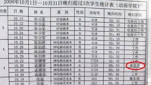 近日,北影校園內(nèi)張榜公布了各系晚歸同學(xué)的名單,把超過3次晚歸的學(xué)生和詳細原因都公布了出來。在網(wǎng)友上傳的晚歸名單中,晚歸的理由有“電視臺工作”、 “吃飯”、“回家”、“拍戲”等,最讓網(wǎng)友意外的是有一名同學(xué)的晚歸理由是“看星星”。根據(jù)網(wǎng)友上傳的這份晚歸名單,“看星星”的這名女同學(xué)在2008年 10月26日晚第四次晚歸,接近凌晨1點才回宿舍。