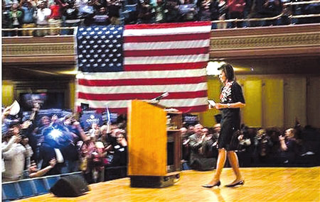 在coolspotters網(wǎng)站查詢“米歇爾·奧巴馬”,就會(huì)出現(xiàn)大量關(guān)于米歇爾服飾的網(wǎng)頁(yè),其中一個(gè)頁(yè)面是在奧巴馬總統(tǒng)就職期間,米歇爾參加一個(gè)演講活動(dòng)時(shí)的畫(huà)面。畫(huà)面上的米歇爾腳穿BandolinoBerry一款黑色鞋子,搭配著JCrew的套裝。