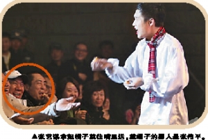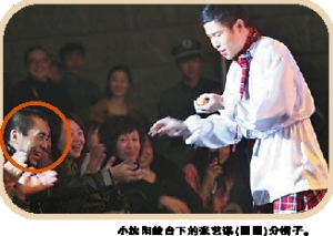 趙家班也乘興拿張藝謀砸掛:閆光明唱起了《我和你》;小沈陽則對妻子沈春陽說:“咱夫妻這么多年了,感情又這么好,人是沒法換了,但還不許咱改名嗎?你就叫鞏俐,你就叫章子怡!”沈春陽單獨表演時,小沈陽在旁邊“不拾閑”地吃水果,還跑到前排觀眾席,把手里的橘子和蘋果分給張藝謀和他的團(tuán)隊,張導(dǎo)也毫不客氣,立即吃下肚子給足小沈陽面子。據(jù)悉演出結(jié)束后,張藝謀還去休息室和小沈陽寒暄一番。