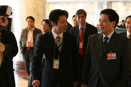 點評:棕色西服的設(shè)計和顏色不是很好,領(lǐng)子設(shè)計得不好,使得衣服線條下垂,十分顯老。而且,里邊的襯衣領(lǐng)子翻出來,顯得很累贅。不過,這種素氣的著裝比較符合兩會嚴(yán)肅的氛圍。