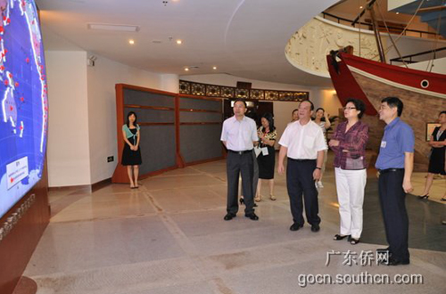 在博物館序廳,李海峰看到毛澤東在60年前為海外僑胞題寫的“僑胞們團(tuán)結(jié)起來,擁護(hù)祖國的革命,改善自己的地位”題詞時,向館長王明惠了解毛主席題詞的時間和背景。在中庭看到粵籍華僑華人的世界分布圖后,就問起了粵籍華僑華人的人數(shù),吳銳成、林琳解答說有三千多萬。李海峰指出廣東的確是僑務(wù)大省。李海峰接著來到李炳源捐贈文物及館藏字畫展廳,充分肯定美國華僑李炳源在海外收購中國文物并捐贈給廣東華僑博物館的愛鄉(xiāng)之情。接著李海峰仔細(xì)參觀了“廣東華僑歷史陳列”主題展,認(rèn)為這個展覽全面、系統(tǒng),陳展的實物和圖片、文獻(xiàn)資料都非常珍貴,其中很多圖片都是沒有見過的。