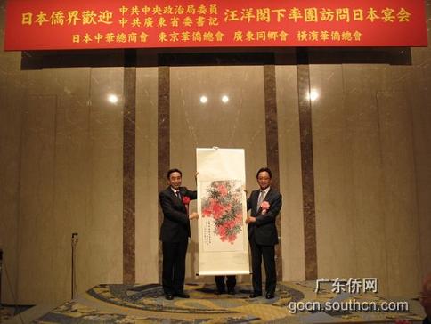 日本中華總商會(huì)會(huì)長(zhǎng)嚴(yán)浩代表宴會(huì)主辦單位向廣東省代表團(tuán)贈(zèng)送了紀(jì)念品,廣東省委常委、廣州市委書記朱小丹向宴會(huì)主辦單位回贈(zèng)了國(guó)畫《紅荔》。廣東省外辦、省外經(jīng)貿(mào)廳等省直有關(guān)單位及有關(guān)市領(lǐng)導(dǎo)也出席了當(dāng)晚的歡迎晚宴。(陳雪婷)