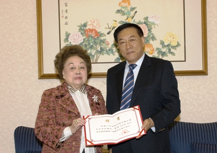 會(huì)見(jiàn)時(shí),林軍向陳香梅女士頒發(fā)中國(guó)僑聯(lián)顧問(wèn)聘書(shū)。