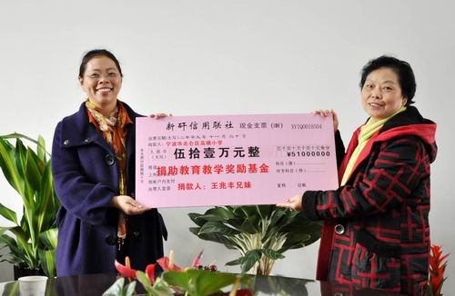 中新網(wǎng)12月3日電 據(jù)浙江僑聯(lián)網(wǎng)消息,11月30日上午,已故浙江省北侖籍港胞王兆豐先生的大兒媳唐秀娟女士代表王氏家族把祖屋拆遷的賠償款51萬元親手交給了新碶街道高塘小學(xué)校長唐亞云的手中,用于設(shè)立“王兆豐兄妹教育教學(xué)獎(jiǎng)勵(lì)基金”。至此,這件長達(dá)10余年的捐贈(zèng)事宜終于畫上了圓滿的句號(hào)。寧波市北侖區(qū)教育局局長胡小偉、新碶街道辦事處主任徐孟杰、區(qū)僑辦副主任姚慧貞、新碶街道黨工委委員林雪鳳出席基金成立儀式。新碶街道辦事處副主任李國東主持儀式