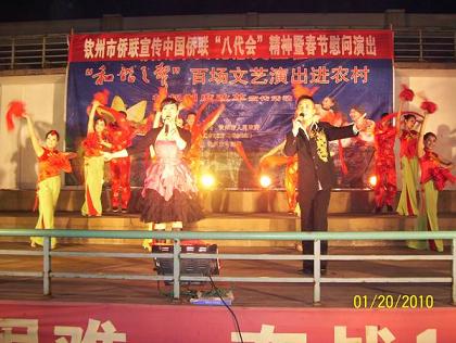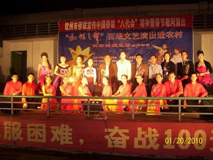 欽州市粵劇團共演出舞蹈、小品、獨唱等20多個節(jié)目,內容豐富多彩,謳歌了欽州改革開放成就,有鮮明地方特色。觀看群眾達到3000多人。