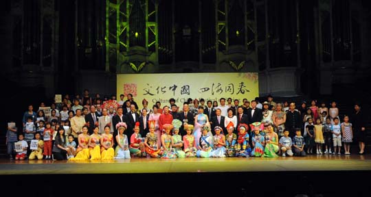演出場內(nèi)燈火輝煌,人頭涌動。藝術(shù)團(tuán)團(tuán)長、國務(wù)院僑辦副主任趙陽代表國務(wù)院僑辦和國務(wù)院僑辦主任李海峰向旅居澳大利亞的廣大僑胞和現(xiàn)場觀眾致以新春的祝福。趙陽指出,新中國成立60年來,中國取得了舉世矚目的巨大成就,這些成就離不開包括悉尼僑胞在內(nèi)的海外僑胞的關(guān)心和支持!拔幕袊に暮M骸彼囆g(shù)團(tuán)為大家?guī)砹俗鎳H人的親切問候和美好祝愿。他表示,國務(wù)院僑辦將一如既往地秉持為僑服務(wù)宗旨,以更加飽滿的熱情為廣大僑胞辦好事、辦實(shí)事,和海外僑胞們一道為構(gòu)建和睦相處、合作共贏、團(tuán)結(jié)友愛、充滿活力的和諧僑社而共同努力。