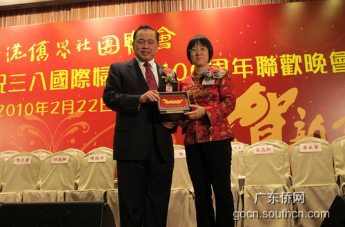 中新網(wǎng)2月26日電 據(jù)廣東僑網(wǎng)消息,2月22日晚,香港龍堡國際賓館冠蓋云集,群賢匯聚。香港僑界社團聯(lián)會在此隆重舉行2010庚寅年春茗暨慶祝三八國際婦女節(jié)100周年聯(lián)歡晚會。廣東省僑辦副主任黎靜出席此次活動,并向該會贈送禮品。