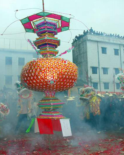 “泮村燈會”始于明朝英宗天頤八年(公元1464年,農(nóng)歷甲申年)正月十三日,至今500多年。每年農(nóng)歷正月十三,開平市水口鎮(zhèn)泮村舉行舞燈盛會,今年當(dāng)?shù)赜瓉砹说谑粚梦锜羰。?dāng)天上午,3個三米多高的大花燈,以羅傘彩旗開路,龍獅共舞,鞭炮齊鳴,巡游于泮村48條自然村,全過程包括扎燈、送燈、起燈、舞燈、打燈,故擇其名為“泮村燈會”。