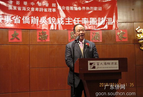 宴會(huì)上,中華會(huì)館等主要社團(tuán)的負(fù)責(zé)人、海外理事代表紛紛做了熱情洋溢的歡迎辭,對(duì)廣東省僑辦主任吳銳成一行務(wù)實(shí)、深入、高效、不辭勞苦的工作表示由衷的欽佩和贊賞。吳銳成在發(fā)言中感謝僑胞們對(duì)訪問團(tuán)的熱情接待和大力支持;向僑胞們?cè)敿?xì)介紹了這次訪問的目的,一是向僑胞們拜年,二是報(bào)告中國(guó)特別是廣東的社會(huì)經(jīng)濟(jì)發(fā)展情況,三是感謝僑胞們對(duì)中國(guó)以及廣東發(fā)展所作的貢獻(xiàn),四是聽取僑胞的意見;再次表示今后廣東省僑辦要在關(guān)注華僑華人生存發(fā)展、維護(hù)華僑華人合法權(quán)益、支持社團(tuán)的革新與發(fā)展、支持華僑華人融入主流社會(huì)、支持華社開展華文教育、傳承中華文化等方面做更多的工作。吳銳成務(wù)實(shí)為僑、熱情洋溢的精彩發(fā)言得到了共鳴,贏得了陣陣掌聲。