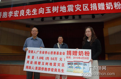 中新網(wǎng)5月4日電 據(jù)廣東僑網(wǎng)消息,玉樹災(zāi)情牽動廣大海外僑胞、港澳同胞的心。在獲悉青海玉樹地區(qū)發(fā)生7.1級強烈地震的消息后,美國僑胞、南加州潮州會館會長李宏良先生立即決定通過廣東省僑心慈善基金會向玉樹災(zāi)區(qū)捐贈1.8噸奶粉,價值約50萬元人民幣,以幫助玉樹災(zāi)區(qū)的孩子渡過難關(guān)。