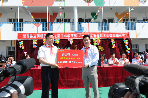 朱奕龍深情地說:和老師同學(xué)們一樣,每一個(gè)“六一”,既是你們最快樂的節(jié)日,也是我最高興、最幸福的日子。因?yàn)?0年前,從銀帝集團(tuán)成立那天起,我就給自己定下了一個(gè)目標(biāo)——每年捐建2所希望小學(xué)。如今,10年過去了,我很榮幸并很負(fù)責(zé)任地向大家報(bào)告,已經(jīng)有60多所奕龍希望小學(xué)扎根全國、全區(qū)各地,我相信不久的將來,還有更多的希望小學(xué)矗立在寧夏山川。2003年,我在黃河岸邊捐建了民樂奕龍小學(xué),吸引了社會上更多關(guān)注教育、關(guān)注孩子們的眼光,更多的教育資金投向了這里。同時(shí),看到一批批學(xué)生從這里走進(jìn)了更高的學(xué)府,我是多么的高興!2008年政治局委員、國務(wù)委員劉延?xùn)|在教育部部長周濟(jì)、自治區(qū)黨委書記陳建國、自治區(qū)人民政府主席王正偉等領(lǐng)導(dǎo)視察了民樂奕龍僑心希望小學(xué),對我也是極大的鼓舞。聽說今年4月,民樂奕龍?jiān)凇皩幭南Mこ?0年”典型表彰活動中,又連獲“模范希望小學(xué)”、“希望工程優(yōu)秀教師”、“希望之星”三項(xiàng)提名獎(jiǎng),我為廣大老師和學(xué)校取得的榮譽(yù)感到非常的高興,為你們?nèi)〉玫某煽兏械綗o比的驕傲和自豪。今天看著學(xué)校優(yōu)良的設(shè)施建設(shè),優(yōu)美的教學(xué)環(huán)境,我深感欣慰,更為默默無聞、辛勤工作、無私奉獻(xiàn)的教師們感到敬佩。你們長期為了教育事業(yè)工作在鄉(xiāng)村,對艱苦的生活環(huán)境和生活狀況無怨無悔,令我非常感動。