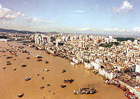三 角 洲 南 端 。 它 東 與 香 港 遙 遙 相 對 , 相 距 42 海 里 ; 北 與 廣 東 珠 海 陸 地 相