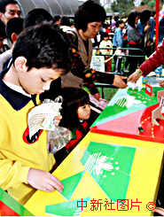 一名兒童在"喜迎澳門回歸,共創(chuàng)美好明天"園游會上認(rèn)真地拼裝澳門特區(qū)區(qū)旗圖案。澳門為紀(jì)念澳門基本法頒布六周年,于二十八日開始舉行系列活動,以增強人們的回歸意識。