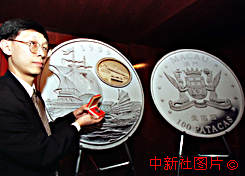 澳門(mén)貨幣暨匯兌監(jiān)理署三十日發(fā)行一枚澳門(mén)回歸紀(jì)念銀幣,這是該署為紀(jì)念澳門(mén)特別行政區(qū)政府於九九年十二月二十日成立之系列紀(jì)念幣中的第一組。銀幣面值一百圓澳門(mén)幣,重一盎司,為澳門(mén)法定貨幣,售價(jià)六十八美元或五百二十五港幣。
