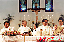 圖片說明: 澳門教區(qū)大主教林家駿(右二)主持圣誕子夜彌撒。