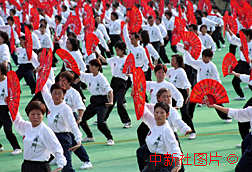 澳門千人太極扇表演隊(duì)伍三十一日清晨舉行集體演練,他們將在慶祝澳門回歸大型文藝匯演"濠江歡歌"中進(jìn)行表演。