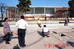 隨著澳門回歸日的臨近,用於舉行澳門政權(quán)移交大典的場(chǎng)館成為澳門的新景點(diǎn),許多來(lái)澳門的游客紛紛在即將落成的交接大典場(chǎng)館外留影。 中新社傳真 毛建軍 攝