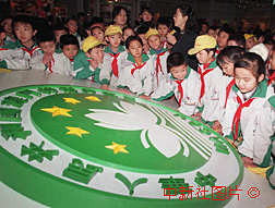"世紀龍騰慶回歸"喜迎澳門回歸大型展覽,十二日在北京中國革命博物館開幕,北京的小學生認真聽講解員講述澳門的歷史和特區(qū)區(qū)徽。