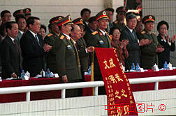 全國(guó)政協(xié)副主席、澳門特區(qū)籌委會(huì)副主任委員馬萬(wàn)祺十九日向解放軍駐澳門部隊(duì)贈(zèng)送書有"威武之師文明之師"的錦旗。