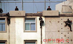 解放軍駐澳門部隊(duì)?wèi)?zhàn)士作攀墻訓(xùn)練表演。